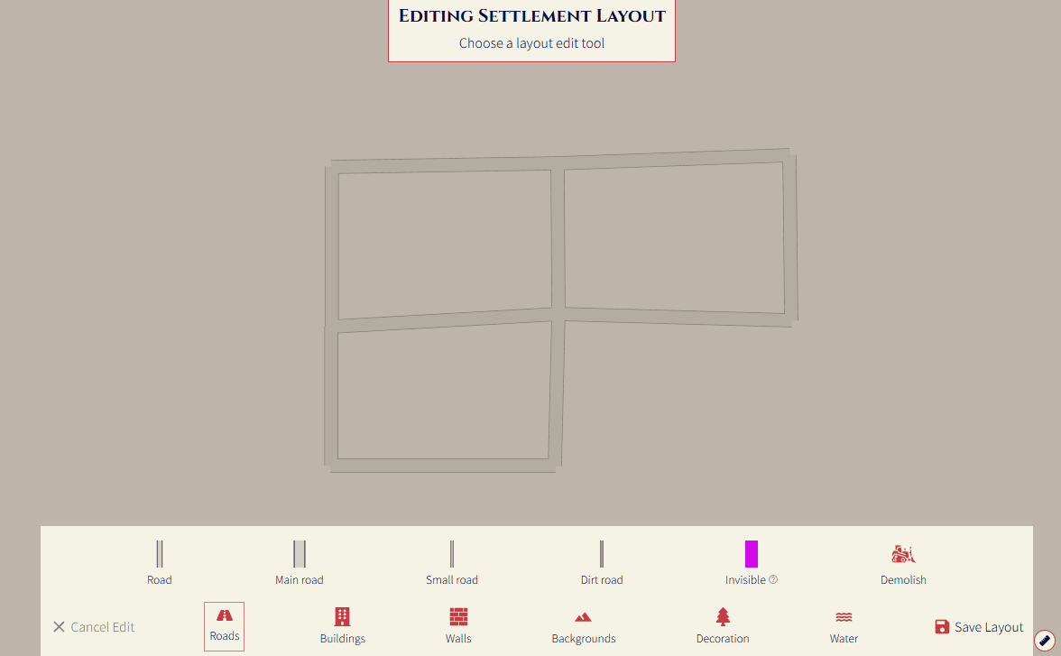 To start editing the map, press the edit settlement layout button above the settlement name: